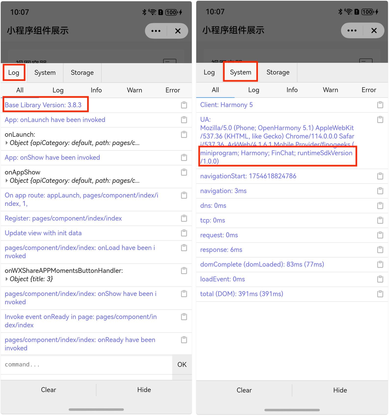 - 如果小程序有开启vConsole,那么从vConsole 中可以看到SDK 版本号和基础库版本号。 打开vConsole后,Log栏前几行有显示基础库版本号;System栏的userAgent中有显示SDK版本号。
