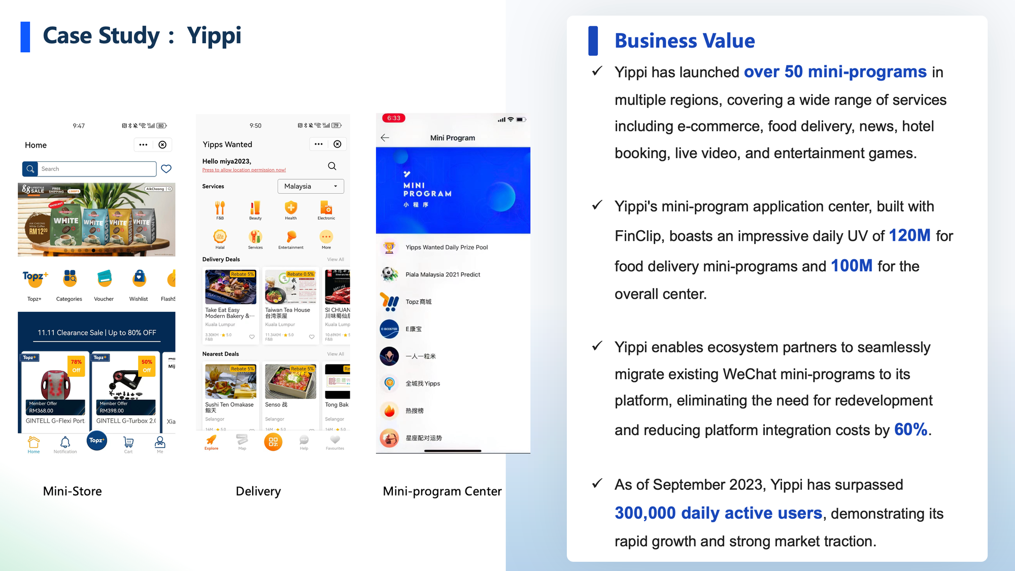 Yippi has already launched over 50 mini programs in multiple regions. These mini programs cover a wide range of services, including e-commerce, food delivery, news, hotel booking, video live streaming, and entertainment games.