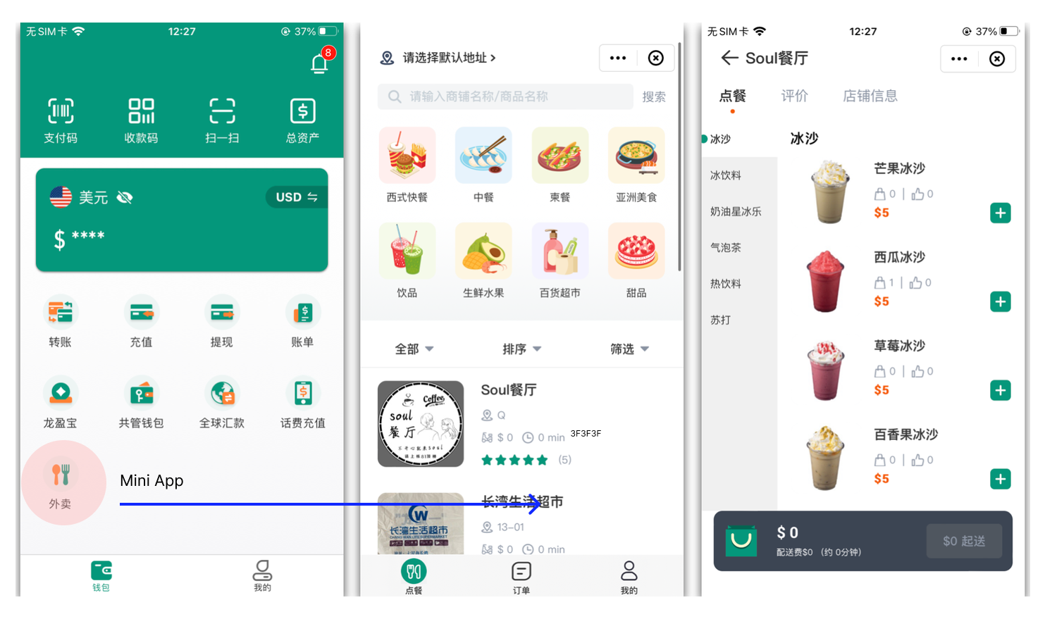 3、LongPay’s inaugural mini-app was a food delivery service. This app enables users to seamlessly perform tasks like searching for restaurants, browsing menus, placing orders, and making payments, all within the LongPay app. The team highlights that mini-app development is user-friendly and has low entry barriers. Post-development, these apps can be swiftly launched via the FinClip management platform. Once integrated with the LongPay app, users gain easy access to the food delivery service directly within their LongPay wallet, streamlining the process.